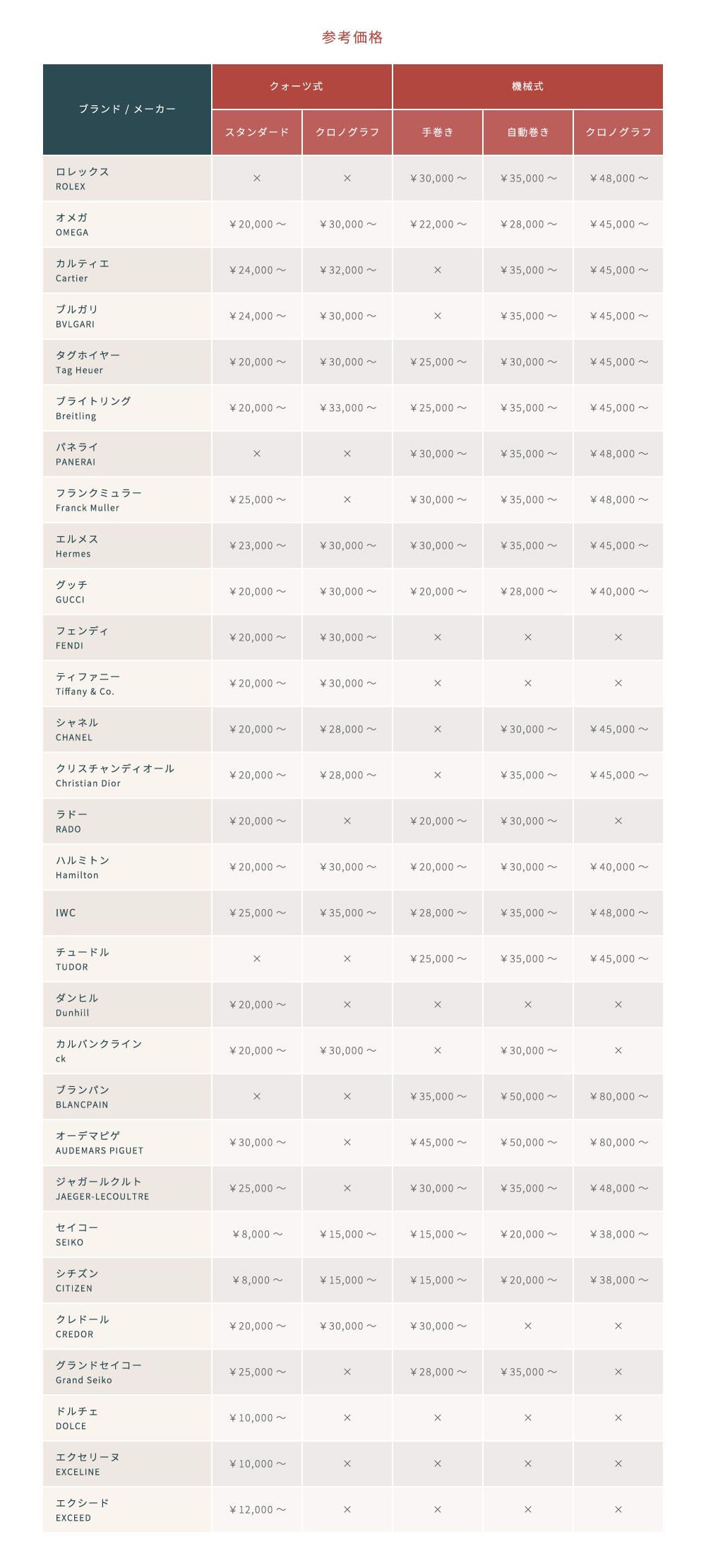各時計メーカー&ブランド時計のオーバーホール料金表(参考価格/円)です。